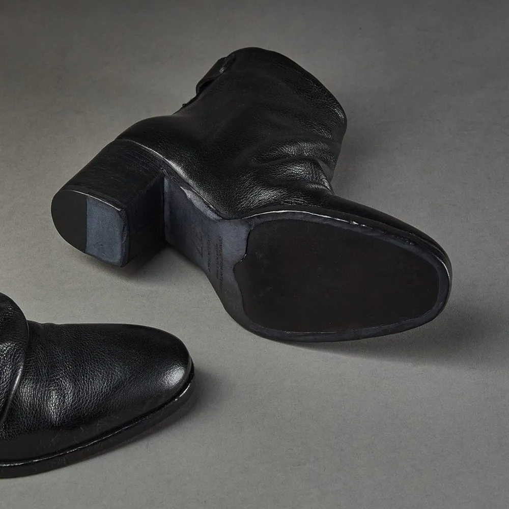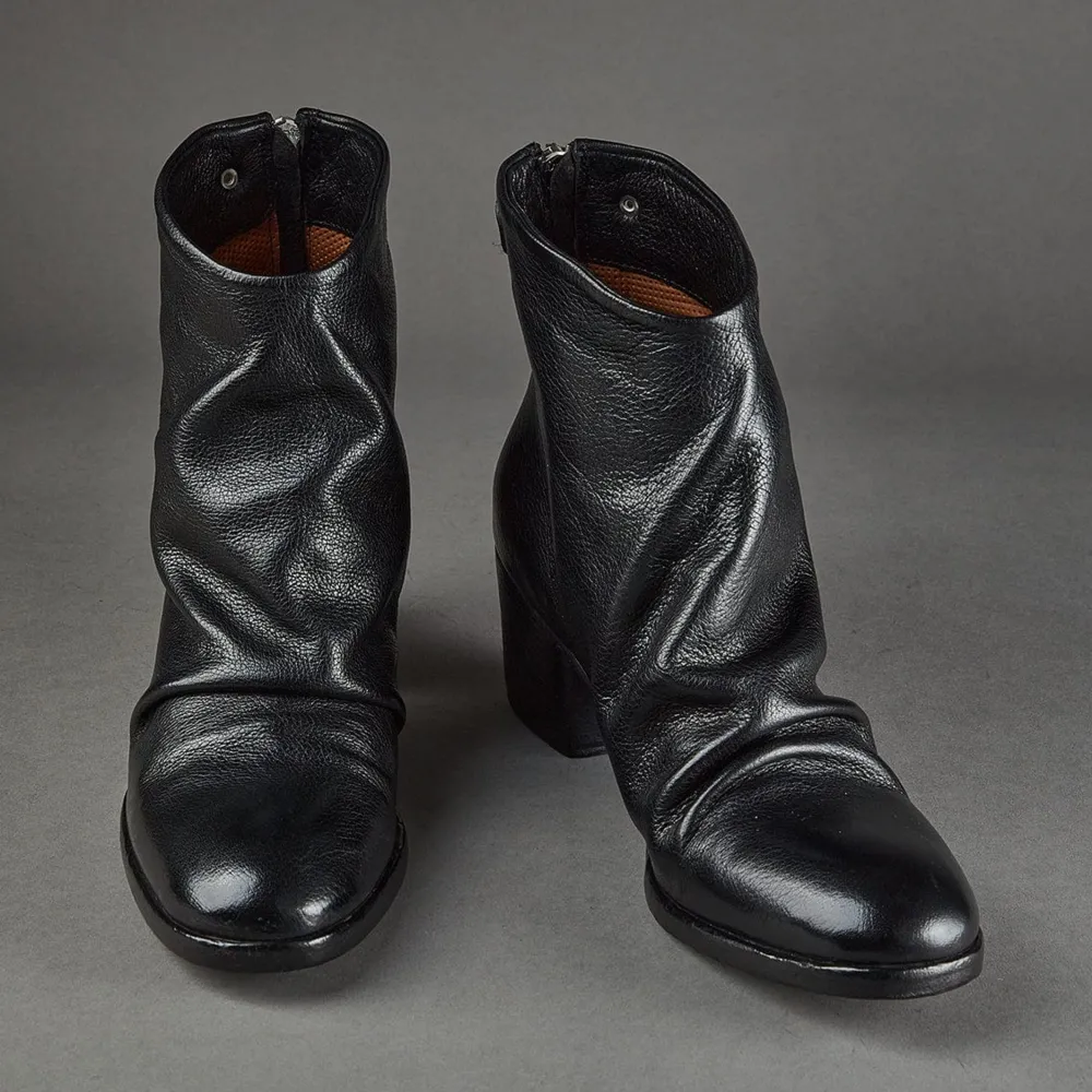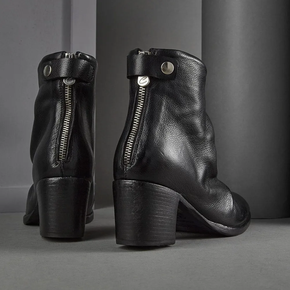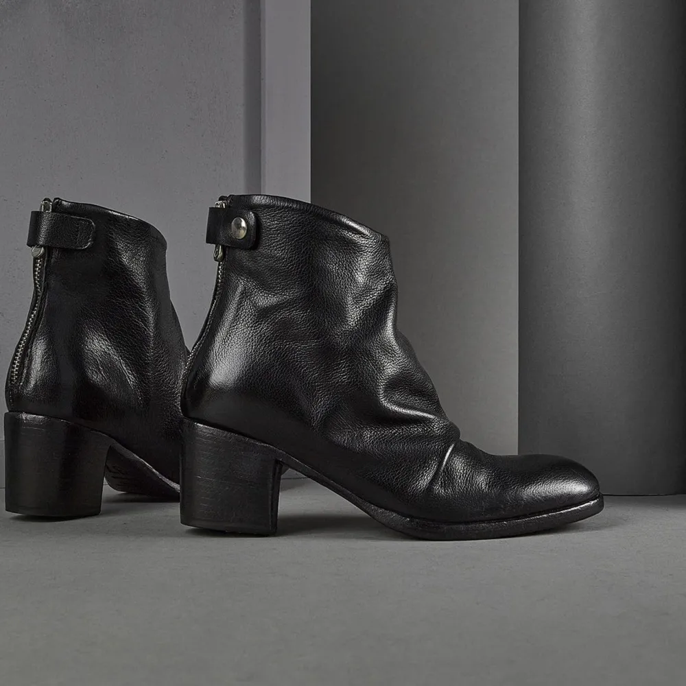 Women’S Black Zip Ankle Boot From Conflict For Interest, Featuring A Gathered Upper Detail.