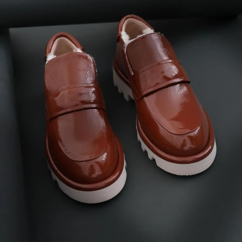 Stunning Womens Loafer From Lorena Piaggi Featuring A Soft Patent Leather Upper Sitting On An Extremely Lightweight Vibram Sole. A Contemporay Classic Featuring A Sherling Lining For The Colder Months Of The Year.