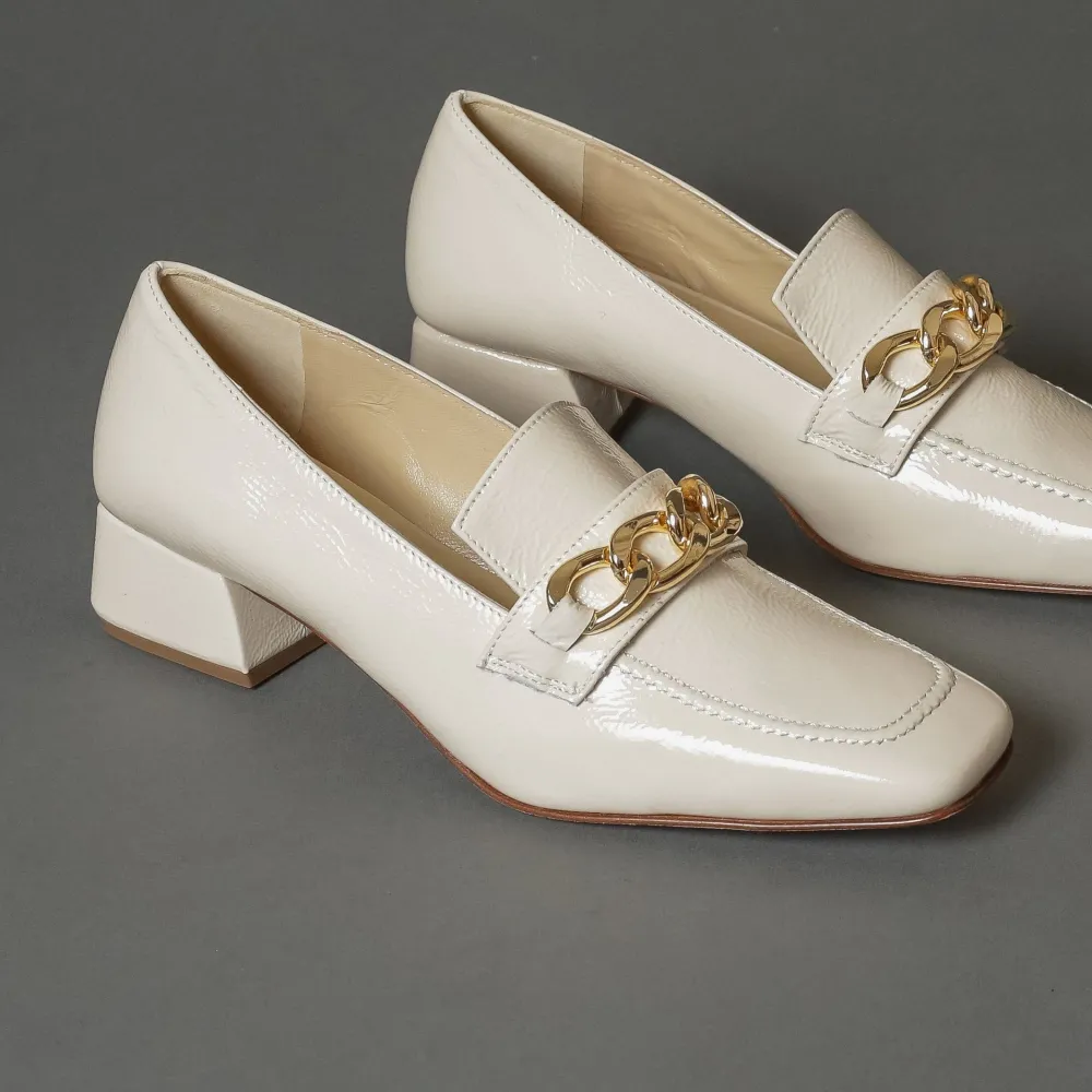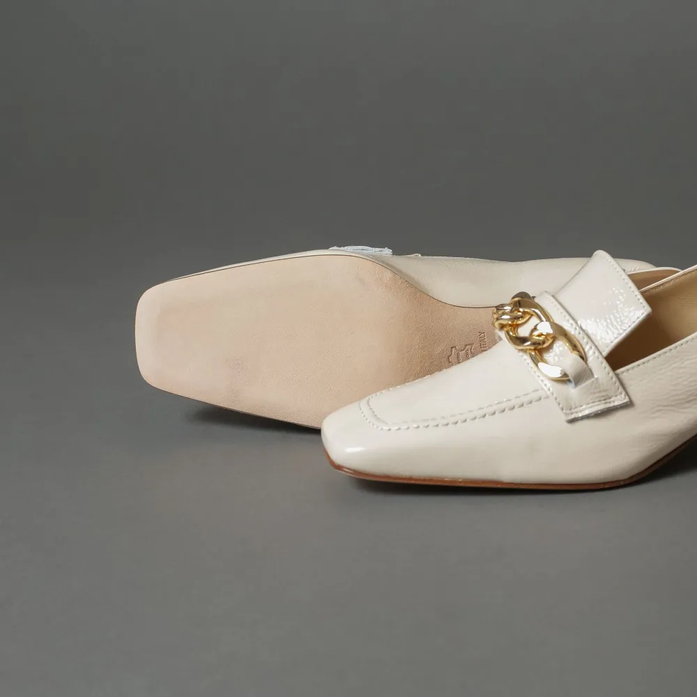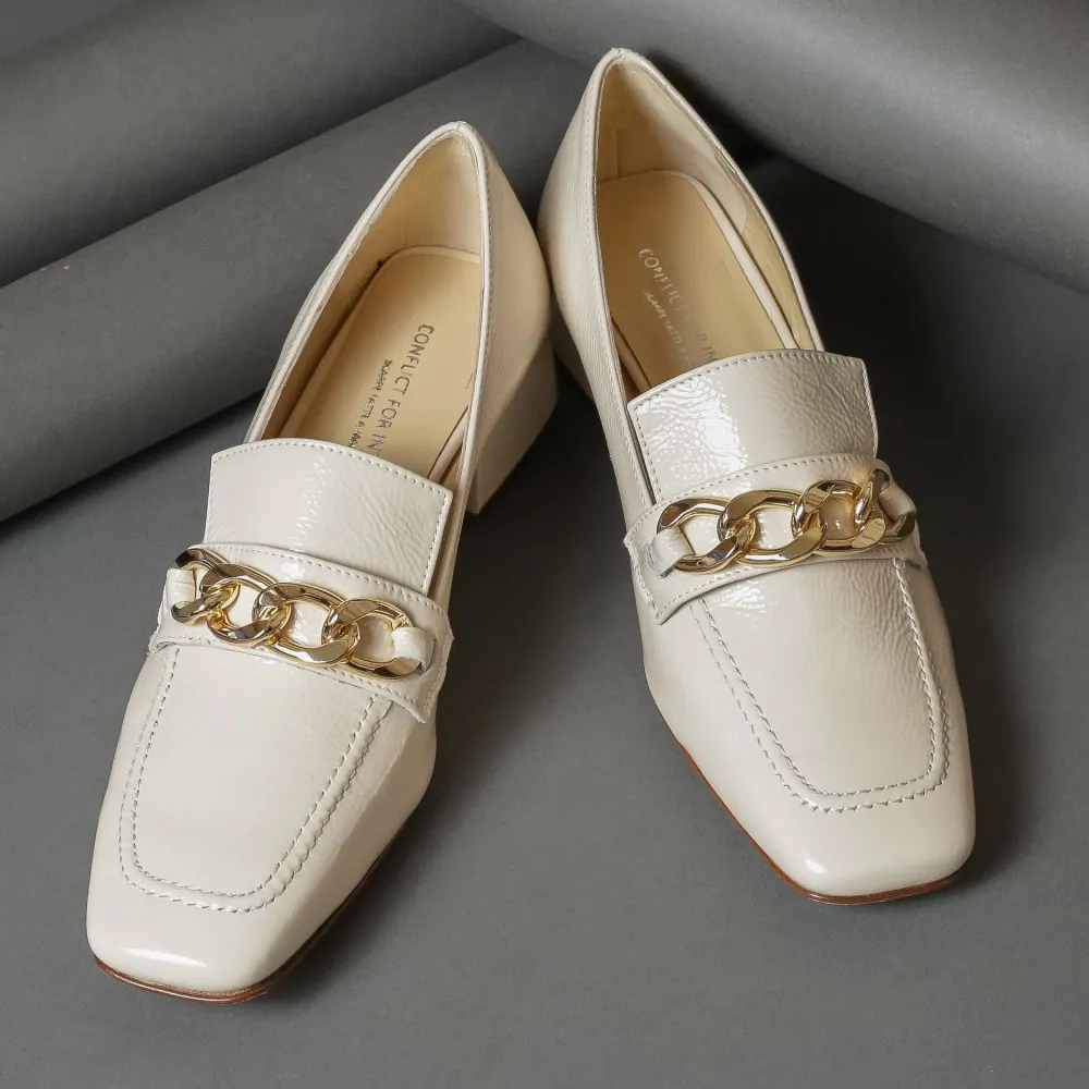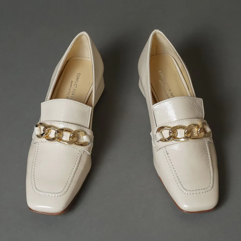 Stunning Womens Flats From Conflict For Interest Featuring A Soft Patent Leather Upper And Gold Chain Embelishment All Sitting On An Extremely Comfortable Sacchetto Construction. A Timeless Shoe That Can Be Worn All Year Round.