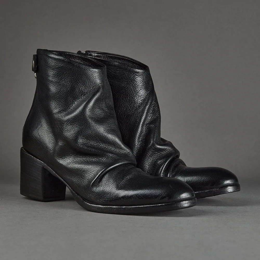 Women’S Black Zip Ankle Boot From Conflict For Interest, Featuring A Gathered Upper Detail.