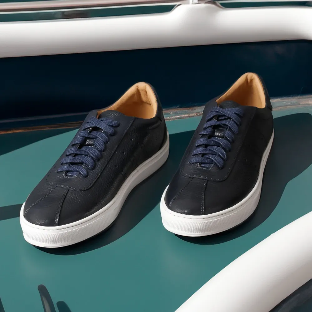 Men’S Slim Line Trainer From Conflict For Interest. These Blue Sneakers Can Be Paired Back With Your Favourite Jeans And For The Fashionista With A Deconstructed Suit. A Timeless Handcrafted Sneaker Made In Italy. Exclusive To 124