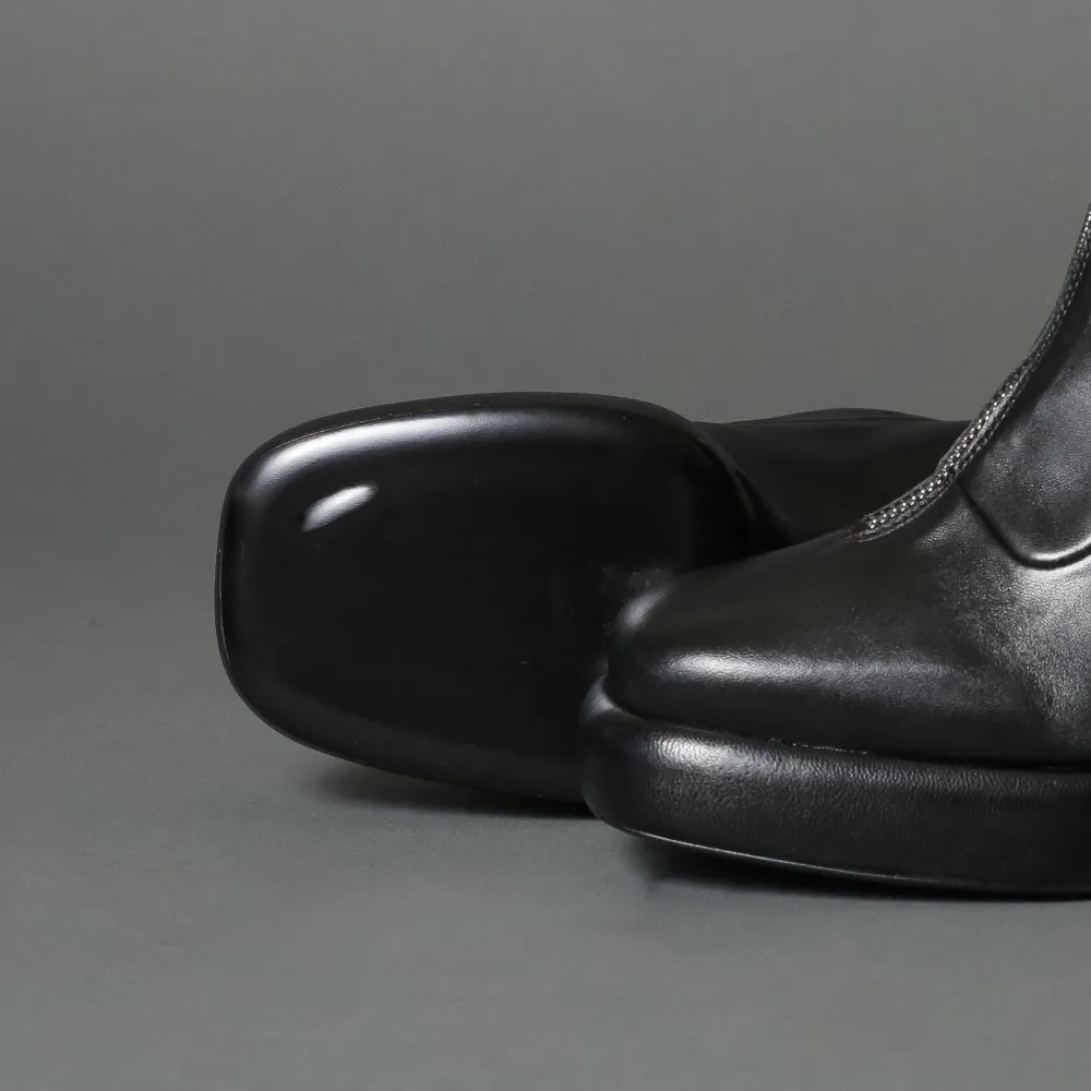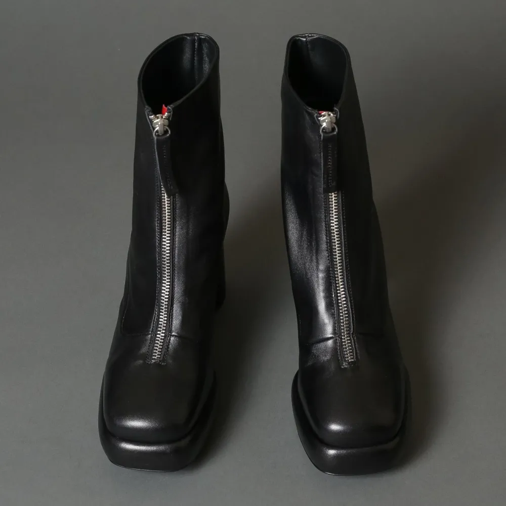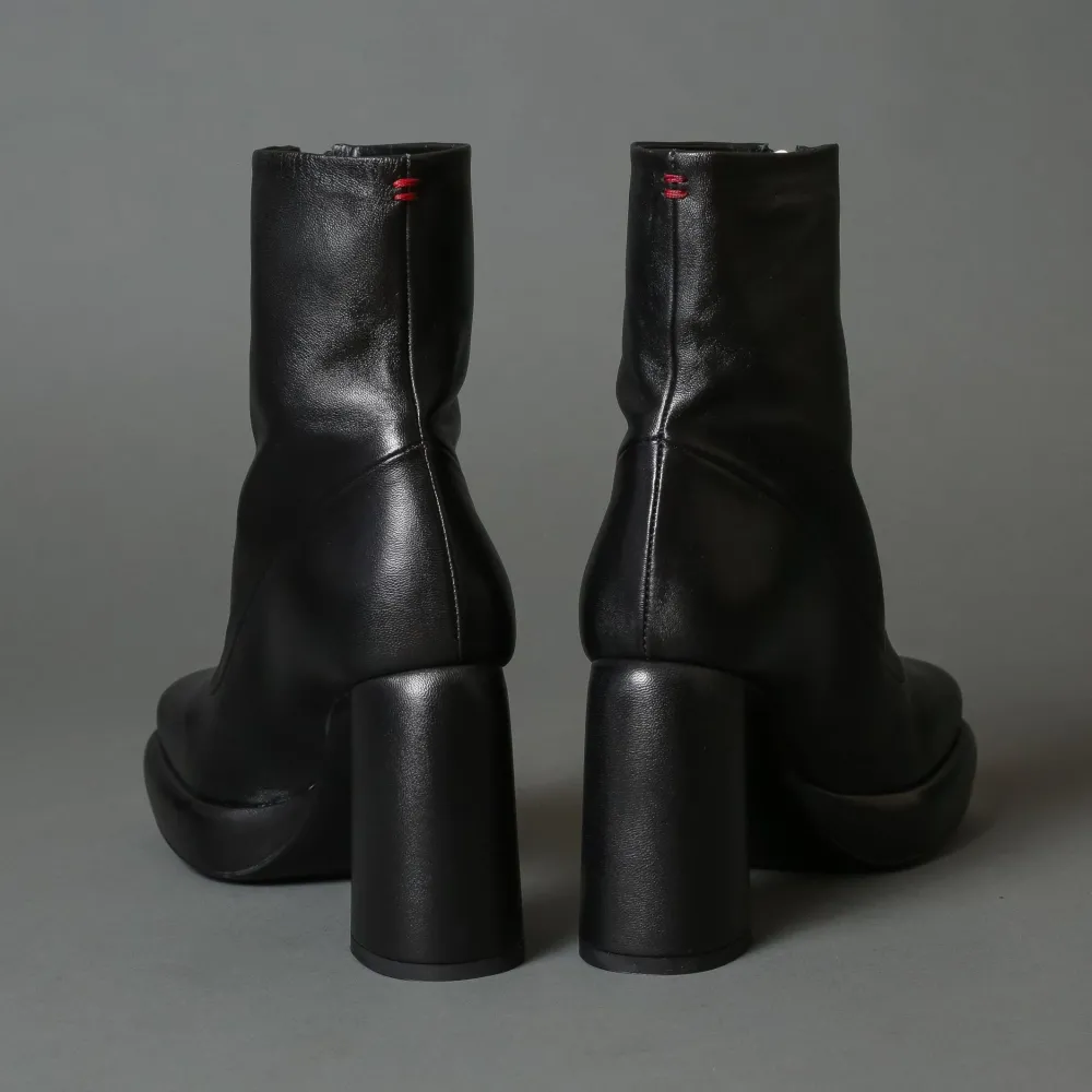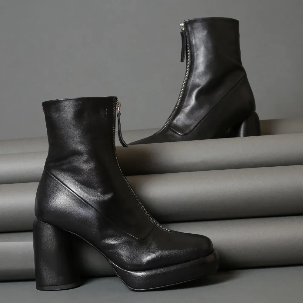 Italian Made Timeless Black Leather Laceup Ankle Boot By Halmanera. Featuring A Square Topline, A Cylindrical Round Heel, And A Asemetric Toe.