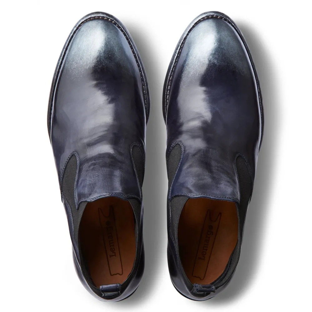 Limited Edition Womens Navy Blue And Silver Brushed Chelsea Boots. They Are Finished With A Washed And Brushed Buffalo Leather Upper Making Them Extremely Soft And Comfortable. A Noteable Signature Finish For A Lemargo Shoe Is The Exposed Shank Which Adds To The Hand Made Finish.