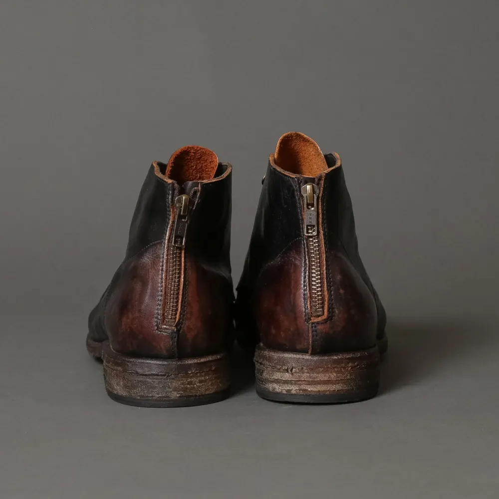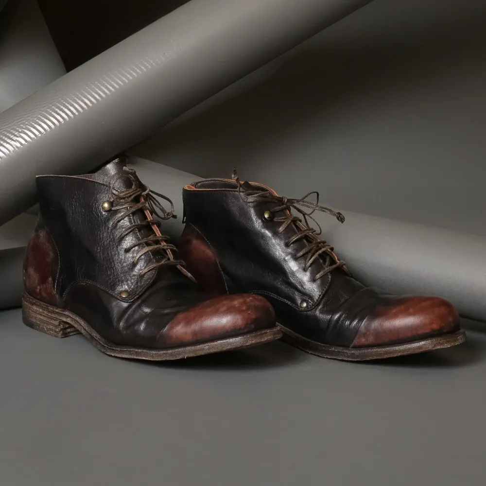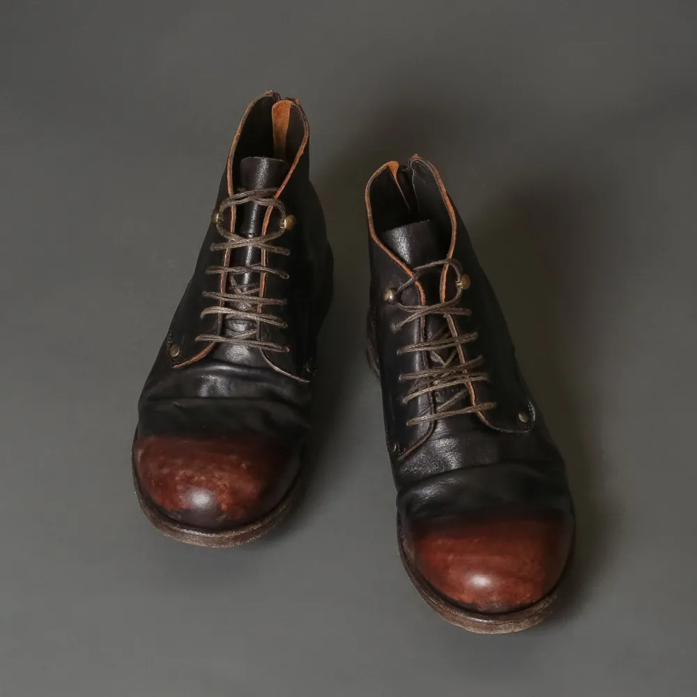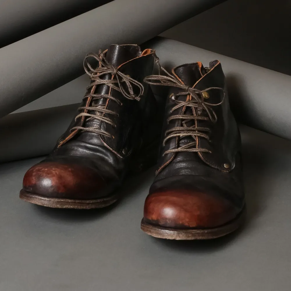 Limited Edition Lace Up Ankle Boot From Artisan Makers Shoto, Featuring A Beautiful Aged Unique Detailed Finish. Sitting On A Double Rapid Blake Contruction Making These Boots Comfortable And Durable. Pair Back Your Way With Your Favourite Apparel.